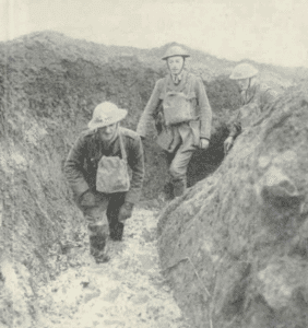 These visitors and visits were of all kinds, from the stupendously official to the purely social. The Divisional General himself sometimes dropped in, with a cheery word and a keen eye for any neglect of standing orders. Gunners dropped in to discuss the barrage lines and our latest bottle of port. Sappers dropped in to tell us that our trench was in a disgraceful condition and that wiring parties must proceed to function forthwith in No Man’s Land. The Doctor dropped in to argue Sinn Fein and to express his disgust at our sanitary arrangements.