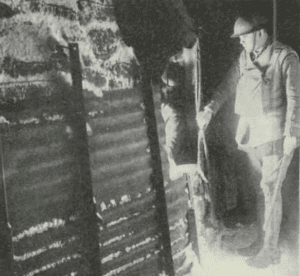 Very fortunately for us, because of the depth and gluelike nature of the mud in them, we were able to get almost the whole way up to our company headquarters under cover without having to use the communicating trenches; and finally, after walking about fifty yards down Railway Support Trench, we came to the little square hole of an entrance in the side of the trench which led steeply down by a staircase of slimy, narrow steps to “Liberty Hall,” our underground dwelling-place, forty feet below.