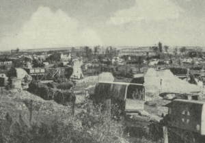 Above is the village of Hargicourt through which Lt Col Beaman and his companions trudged on their far from enjoyable evening walk. In the foreground are units of the three classes of wheeled traffic that formed the bulk of that passing along the roads of France and Flanders in war time-a transport lorry and a motor ambulance. Though inevitably badly damaged, Hargicourt was not so completely smashed as front line villages farther north.