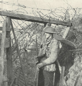 The work of a wiring party and the spinning of their unpleasant webs required no little skill. Above is an unusual example of this work. It is a barbed wire gate which could be let down against approaching raiders, and in the narrow trench they would have very little chance of cutting through it. The scene is in the front line, so the sentry has his bayonet fixed and his gas mask at the ready.
