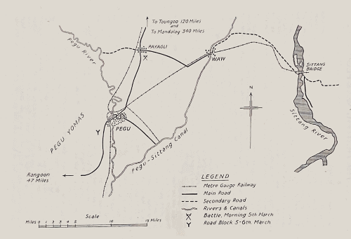 This formation had been very badly mauled at the Sittang Bridge, and urgently required time to reorganize. By the end of February the Japanese had occupied Waw and Payagli, but were not in any great strength, and there was no real threat to Pegu. Pegu, a straggling town with a population of about 20,000, is just over 50 miles north-east of Rangoon.