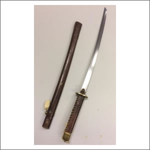 A katana is a Japanese sword characterized by a curved, single-edged blade with a circular or squared guard and long grip to accommodate two hands.